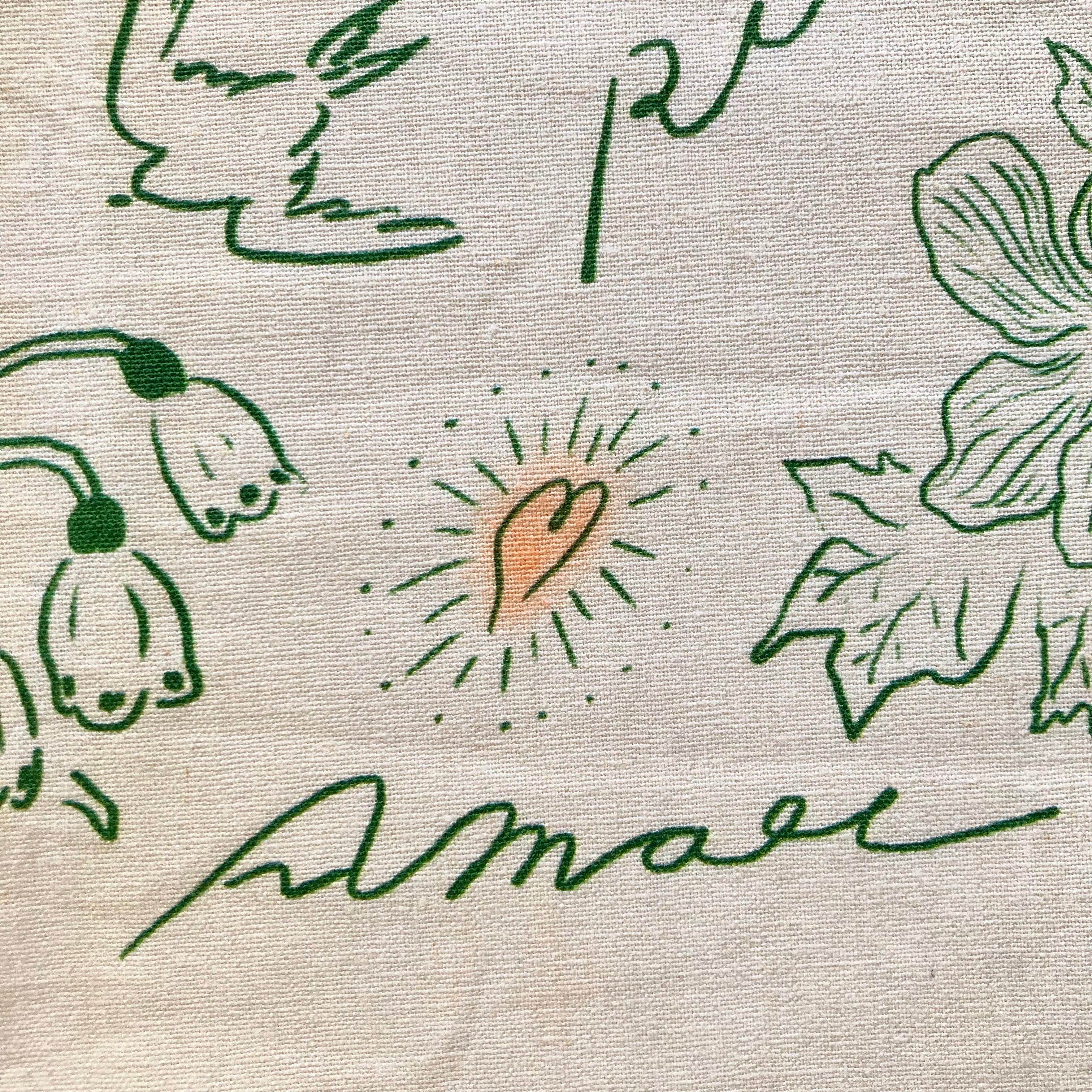 手づくりの為、多少の印刷のズレ、生地のゆがみがあるかもしれません。手しごとの愛嬌としてご理解いただけますと幸いです。